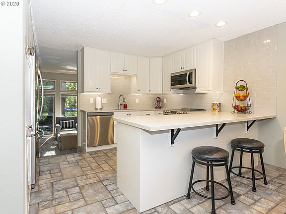 Imagine coming home to this tranquil townhome everyday...Nestled in the trees within the highly desirable Willamette Green community.The private front courtyard is a perfect spot for al fresco meals and it is conveniently located next to the DR & Kit.Coming in the front door you see down the foyer, through the sunken living room to the treed park like setting and pool.The home features a fully remodeled kitchen,3 bedrooms, one main w/en-suite & another full bath.Inclds all appliances & hm warr.