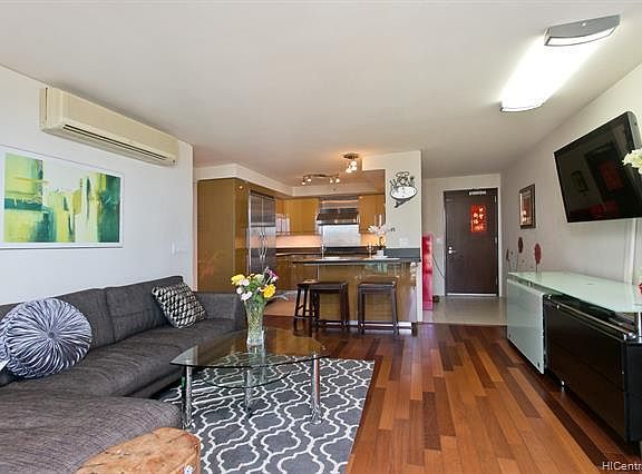 Award winning newer luxury building sitting at the top of Downtown Honolulu. 24 hour security and amazing amenities, including infinity pool, whirl pool, BBQ cabanas, fitness center, party room, theater, music room, yoga room, children's playground, and a dog park. Dog friendly up to 60 lb. This unit on the 22nd floor has nice open views of the business district, ocean and mountains. Hardwood floors in the living room and hallway and Viking stainless steel appliances. Fabulous location so close to many great restaurant and a quick access to the freeway.