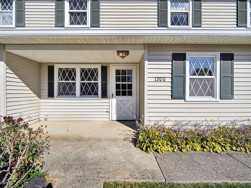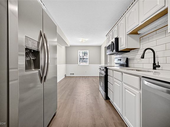 Introducing a beautifully updated three-bedroom townhouse featuring one full bath and one half-bath, located in the Royal Court Condominium Development. This residence offers approximately 1,300 square feet of thoughtfully designed living space, including a spacious eat-in kitchen with white cabinetry, new quartz countertops, and a tile backsplash that flows into an expansive living room. The first floor is equipped with a laundry room and a convenient half bath. A front patio is accessible from both the living room and kitchen. Recent improvements include modern LVP flooring and baseboards throughout the main level, refreshed kitchen cabinetry paired with neutral countertops, a new garbage disposal and faucet, updated light fixtures and ceiling fans, two new bathroom vanities and mirrors, a new furnace installed in 2024, and freshly painted interiors. Brand new kitchen appliances, along with a washer and dryer, are provided. The master bedroom features a walk-in closet, while two additional spacious bedrooms are situated on the second floor. The attached garage offers direct access to the kitchen area, ensuring protected entry after parking and shelter from any weather Cleveland can throw at you. Come and make this beautiful house your home!