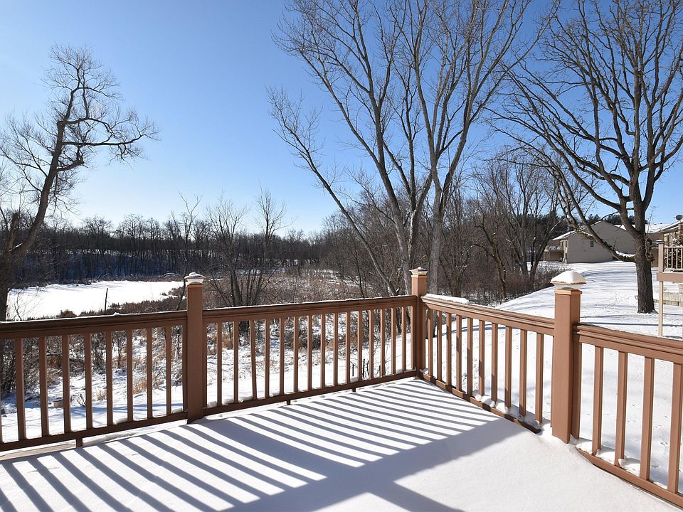 Relax and enjoy tranquil views of the pond and nature from your maintenance free main level deck. This contemporary 3 bedroom, 3 bath open concept design with cathedral ceiling, features oak flooring throughout the kitchen, dining area and foyer. An abundance of oak cabinets with corian counters in the kitchen. A great room with gas fireplace, spacious main floor master with walk-in closet and private bath. Full guest bath and 2nd bedroom on main too! The exposed walkout lower has a spacious family room, 3rd bedroom with private bath, perfect for guests. Plenty of storage and also a workshop (separate room) with egress window in the unfinished area of lower. Workshop could easily be finished in to a 4th bedroom or office? Minutes away from shopping and downtown Burlington
