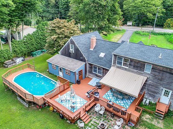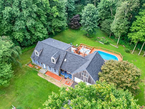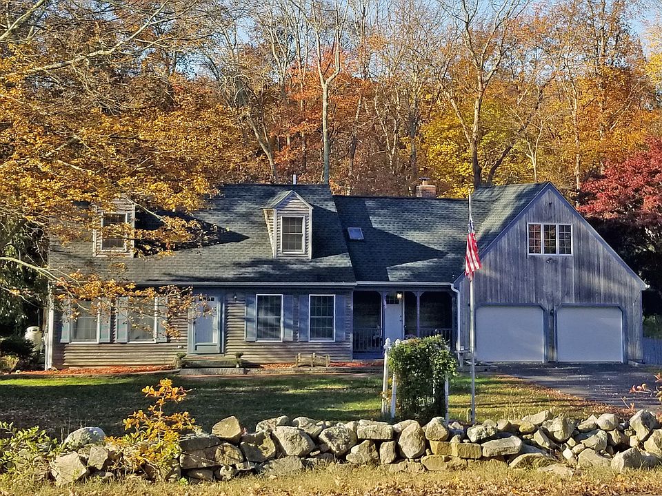 A Fantastic value...plus the sellers are offering $5,000 credit for painting and deferred maintenance. This large cedar sided Cape sits on a lovely 1.27 level lot in a rural setting. Stone Walls along the road will greet you as you enter the newly paved driveway. This home features a first floor master bedroom with full bath en suite, two additional bedrooms upstairs with Jack & Jill bathroom, a gorgeous updated kitchen with granite counters and hardwood floors. The family room has exposed beams & vaulted ceiling where you can sit in front of the fireplace with wood stove insert or walk out to tiered decks to the pool. The bonus room is a WOW featuring a bar and half bath. The finished lower level offers an additional half bath with great spaces for a home gym, media room or game room. The home also offers ductless AC wall units on the main and upper levels, newer roof, newer Buderus furnace, an over sized 2 car garage, security system and a 24 x 8 outbuilding that abuts the pool. Book a private showing today!