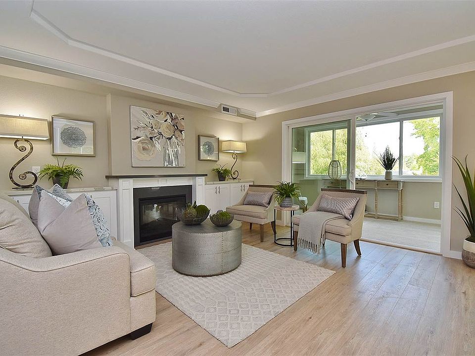 L'Estrange & Associates Newest Designed Masterpiece. BEAUTIFULLY REMODELED and expanded Sonoma Wrap! Two bedrooms, two full baths. Master bedroom suite. Balcony and wrap has been enclosed and has a built-in desk increasing living space to approx. 1370 square feet. Chef's kitchen has white shaker style cabinets, designer quartz countertops, subway tile backsplash with mosaic accents, stainless appliances, recessed and pendant lighting. Living room and dining area have built-in cabinets and an electric fireplace with remote. The two full baths; one with a walk-in shower & the other a shower over tub, both offer tile surrounds and tile floors. Both kitchen and bathroom have sunny windows. Stacked washer & dryer. Top of the line features and a lovely outlook too!