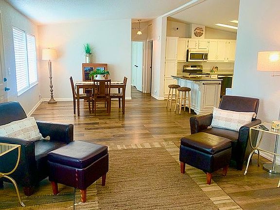 This newly renovated and move in ready 2 bedroom, 2 bathroom mobile home situated in the Quail Run 55 plus adult living mobile home park is just steps away from Dykstra Park and features low maintenance landscaping, paved and covered car port, and a shed that can also be used as a workshop. This pet friendly home features a fully fenced self-watering grass area complete with a pet door for easy in and out dog or cat access. This open concept floor plan features a spacious eat-in kitchen with plenty of storage and a convenient island for meal prep and a seating area while entertaining guests. This mobile home also features a new state-of-the-art central heating and air system complete with a Wi-Fi and digital thermostat. The peach tree in the front yard reminds you that you are experiencing small town country living while having the comforts of a well maintained adult mobile park.