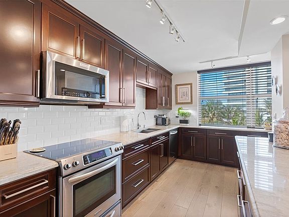 This ocean front condo has been totally renovated and has the additional protection of all hurricane impact windows. Beautiful wood cabinets with KitchenAide all stainless steel appliances and natural quartzite counters in kitchen and baths. Hunter Douglas electronic window coverings in all rooms. Newer A/C and hot water heater plus new full capacity LG washer and dryer surrounded by a built-in storage unit with loads of space to store so many items. Second bedroom boasts a custom built wrap around wall of closet and storage units plus a built in desk. California walk in closet plus an additional wall of built ins in the primary bedroom. Basically, storage galore in the unit! Need we mention stunning wood floors throughout? Enjoy a cup of coffee on your patio while enjoying your ocean view