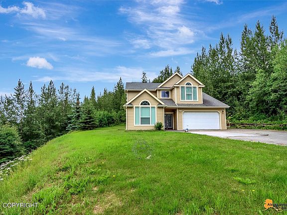 Very nice 4 bed, 2.5 bath, 2 car garage, 2048 sf 2 story home on a private south facing lot with astounding mountain views and lots of sunlight. 9' ceilings, separate office, in-floor heat, central vac, crown molding, asphalt driveway, shed/sauna, and lots of additional upgrades. Excellent commute location & close to downtown Wasilla.