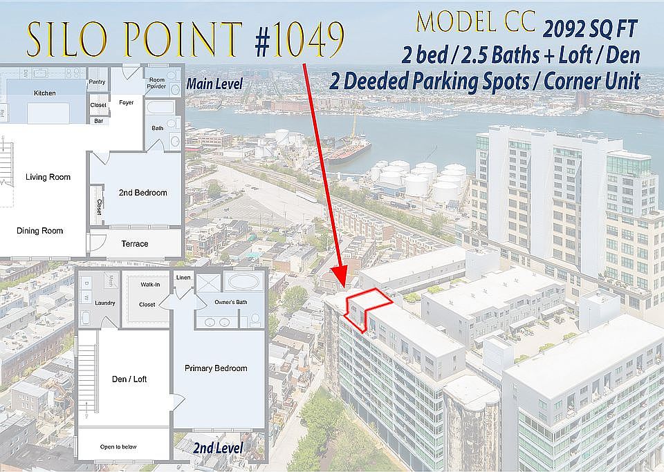 Welcome to luxury condo living in a Townhome, in the sky. This 2 bedroom 2.5 bath + loft/den corner unit is a must see! The gourmet kitchen includes granite counters and thoughtful renovations with upper cabinets that extend to the ceiling, a beautiful white tiled backsplash, pull-out drawers in all lower cabinets, and addition of a pantry. The 2nd level loft / den / office / bonus room includes custom built-in, overlooks the dining room and boasts beautiful water and city views. The owners suite includes a huge renovated walk-in closet and sitting area with incredible skyline views. The ensuite bath is filled with natural light and a large linen closet outside the door. As a bonus, this original-owner added siltstone to all windowsills and a sink in the 2nd level laundry room. Other notables include the whole home water filtration system, energy efficient washer and dryer that are less than 1 year old, Harwood flooring throughout the home, and 2 deeded parking spots located in the secure resident garage convey.