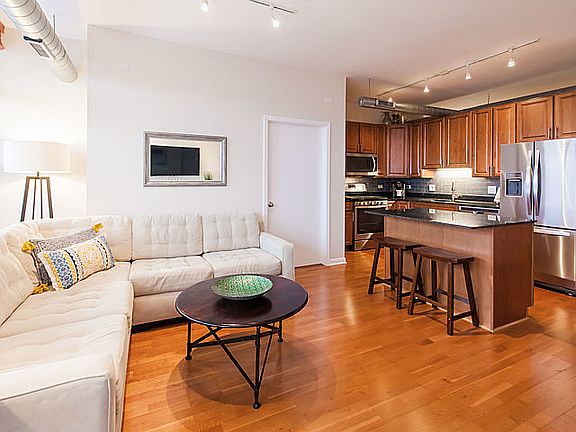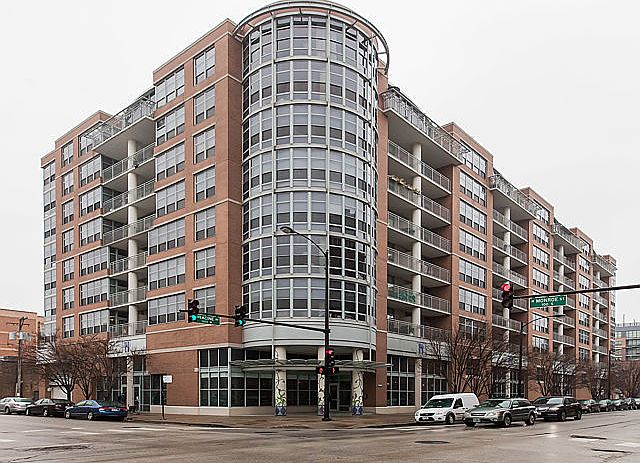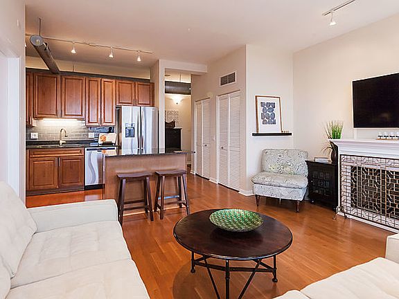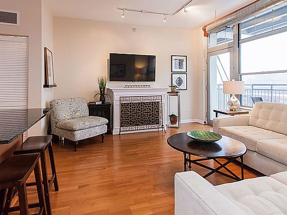 Spacious 1 BR + Den, 1 1/2 bath in the Metro building located in the heart of the West Loop. The den is perfect as a second bedroom for guests with lots of closet space or great as a home office. Kitchen features 42 inch cherry stained cabinets, glass tile back splash, stainless steel appliances, granite counter tops, and island for casual dining. Living room features a custom gas fireplace and leads to a large 16 ft balcony perfect for summer grilling and outdoor dining. Light filled master bedroom is fully enclosed with 2 custom organized closets. Master bath has double bowl vanity and deep soaking tub. Hardwood floors. Wired for sound. In unit washer/dryer. Full height storage locker. Prime 1st floor garage parking space #29 included in the price. 24 hour door staff and gym. Easy access to highway, walk to public transportation, parks, shopping, restaurants, nightlife and Restaurant Row!