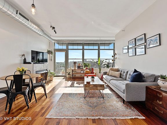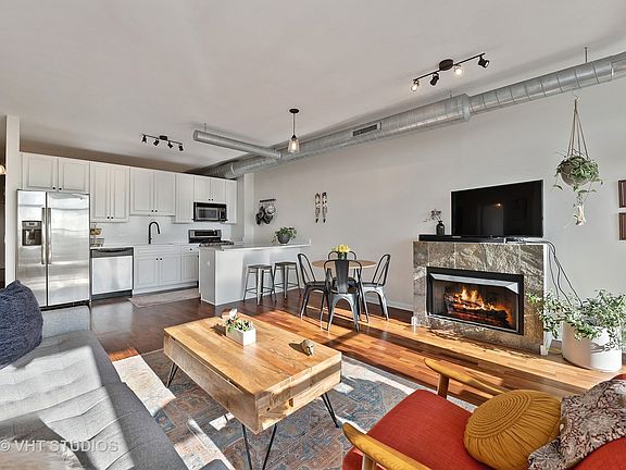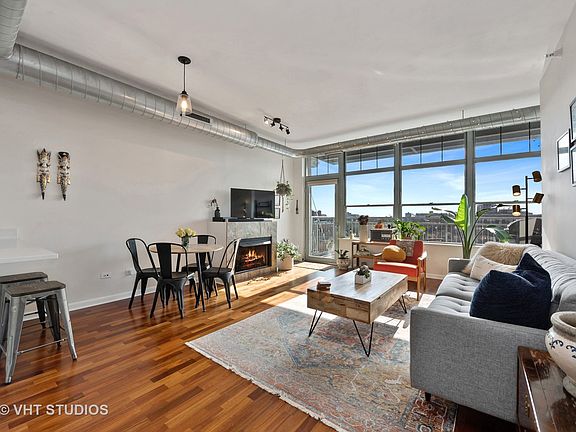 Welcome home to this stunning and remodeled 2 bedroom + large den/office, 2 bathroom urban soft loft with incredible natural light, gorgeous unobstructed western views, and a private 15' balcony in the heart of the WEST LOOP! This open concept condo is the perfect layout with split beds and baths and has a large open living space complete with gas fireplace, hardwood floors, and a designated area for dining. Beautiful recently updated kitchen with refreshed cabinetry + hardware, new white quartz counters, stainless steel appliances (new 2019 refrigerator), and a breakfast bar. The king-sized primary suite has two walls of spacious closets and an en-suite remodeled bath with new double vanity, new modern tile and lighting, soaking tub, and standalone shower. Spacious 2nd bedroom can comfortably fit a queen set. The 2nd bathroom was also entirely remodeled with new vanity, tile, and lighting. The large den (8'x10') makes the perfect office! In-unit laundry and two heated garage parking spots #58 + #84 (separate deed) available for $30k each. Full Amenity building with 24 hr door staff, fitness room, and additional storage cage included. Ideal West Loop location just a short walk to Target (5 mins), Marianos + Whole Foods (10 mins), Skinner Park, Madison St restaurants/bars/shops, Fulton Market & just 3-4 blocks to McDonalds + Google offices!