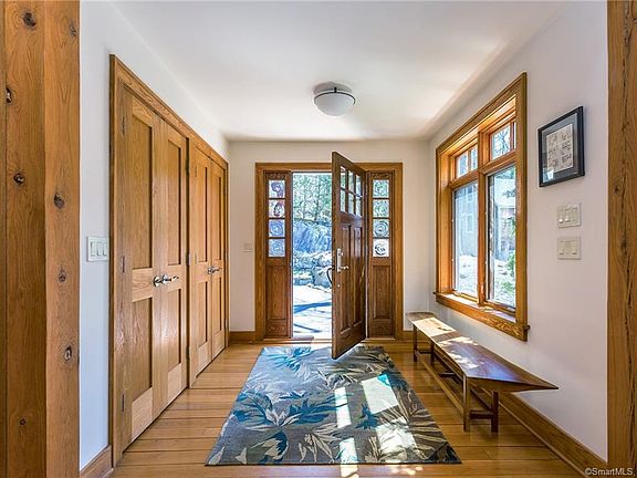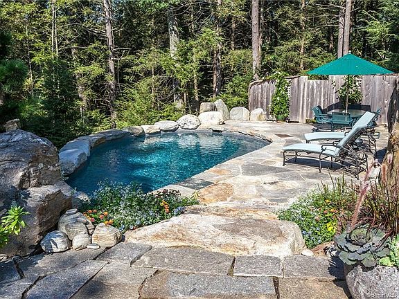 Top quality Arts & Crafts style home custom designed and built by a highly regarded local craftsman/owner. Located just over the Roxbury line in Southbury and only a short walk to the Shepaug River. The house has vaulted ceilings, hand crafted beams, an open floor plan, beautiful natural light from abundant windows and seasonal river views. The main floor has a living room with stone fireplace, a dining room overlooking the deck, a gorgeous kitchen with cherry cabinets, granite counters, generous center island and a sitting area with access to the outdoors. The private master bedroom suite has a spacious walk-in closet and a luxurious master bath with views of the pool. The second floor has office space on an open landing, a sitting area and a bedroom suite with full bath. The lower walk-out level is finished with a third bedroom suite with full bath, a den and an amazing yoga/exercise room with radiant heated floor. This lower level has light filled spaces with large windows facing west. There is room for a kitchen to complete a separate apartment and access to the 2 car garage. The site is sloping amid rock outcroppings that create the perfect setting for a private free-form heated Gunite pool and perennial gardens. The separate two story barn has potential for office space, an art studio or additional storage.