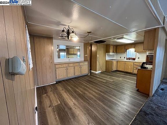 2 Bedroom, 2 bath home in Hayward close to shopping, restaurants, & nice commute location. Living room with double pane windows & pellet stove. Dining area with storage, and open to kitchen area. Laminate flooring in dining, kitchen, & hallway. Nice size bedrooms. Hall bath with updated solid surface stall shower. Ample size primary bedroom with door to screen room and has it's own bath with single sink and updated solid surface stall shower. Enclosed screen room offering some storage and washer & dryer. Perimeter lot with storage shed and some usable rear yard space & carport area. Across from clubhouse & pool. Walk across to guest parking. Low space rent!