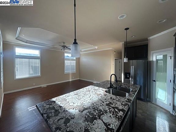 Newer Manufactured Home features: 2 bedrooms + den; 2 full baths; 9' flat ceilings and crown molding throughout; living room with tray ceiling; laminate flooring in living room and hall; kitchen with stainless steel appliances, granite counter tops, and large pantry; dining area with bay window; primary bedroom with walk in closet and private bath; laundry room with washer, dryer, and storage cabinets; AC unit, low monthly space rent & more!
