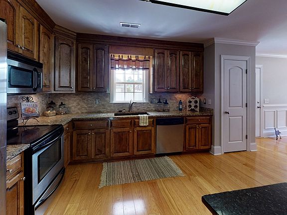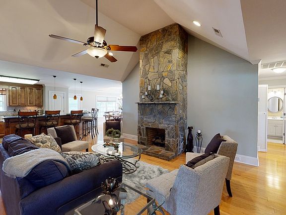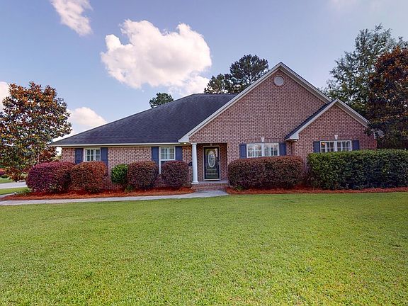 OPEN floor plan in this beautiful five bedrooms & three bath brick home in Carolina Palms with all smooth ceilings, plantation shutters and central vacuum. Harwood floors in the open area of GRTRM, foyer, kitchen and dining room. Stone fireplace from floor to ceiling in the vaulted GRTRM. Foyer with double tray ceiling, kitchen with granite and tile back splash, large raised breakfast bar to seat 6, pantry and stainless appliances. Dining room with tray ceiling with crown molding & wainscoting. Split bedroom floor plan downstairs with four bedrooms and the 5th bedroom upstairs with full bath and closet. Master bedroom is 21 x 15 and has a walk-in closet and a deluxe master bath with shower, large soaker tub & dual sinks. Corner side garage, sprinkler, white vinyl fence, porch & patio.