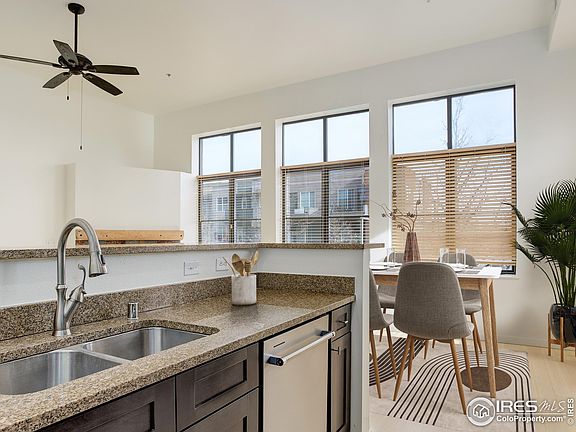 Experience the best of North Boulder in this freshly updated, top-floor, 2b/2b corner condo. With immediate access to world-class hiking and biking trails, popular restaurants, Amante Coffee, and neighborhood shops, this home blends modern comfort with a true North Boulder lifestyle. Detached garage w storage. Inside, the residence features soaring 12' ceilings, expansive windows, and an airy open floor plan filled with natural light. Freshly refinished hardwood floors flow through the main living areas, complemented by new interior paint and new carpet. The living room includes a gas fireplace for cozy evenings. The updated modern kitchen offers stainless steel appliances, generous counter space, and newer cabinetry, creating a functional layout ideal for cooking, entertaining, or everyday living. Recent upgrades include a newer refrigerator, dishwasher, washer/dryer, and HVAC system, ensuring a turnkey, move-in-ready home with reduced future maintenance.The spacious primary suite is a bright retreat with large windows, a walk-in closet, ensuite bath, and sliding door to the deck. The second bedroom provides excellent versatility for guests, a home office, or creative workspace, with easy access to a full second bath.A private in-unit laundry, storage options, and a top-floor corner location enhance convenience and privacy. The elevated position brings in additional sunlight, better views, and quieter living with fewer shared walls.Located in the sought-after Uptown Broadway area, this home offers unmatched proximity to North Boulder's extensive trails, making outdoor recreation part of daily life. Dining, coffee, boutique fitness, local markets, and beloved small businesses are all an easy walk away. With its combination of modern updates, bright top-floor living, and a premier North Boulder location, this residence is a rare opportunity for buyers seeking style, convenience, and immediate access to both nature and neighborhood amenities. Easily lock and leave.