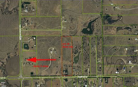 Close in Executive build site! 9.58 Acres conveniently located just 2 Miles East of Derby. Possible pond site with seasonal draw, trees, and excellent walkout new build elevation changes. Multiple possibilities for the investor with rural residential zoning allowable uses or zone change. Would make a great Church Site, Retreat, Brome Pasture to run your horses on, or small development. There is an ugly older manufactured home with utilities that could be renovated for income, equipment shed, and well house-storm shelter included. Numerous trees along the frontage with Rural Water Option. No covenants and restrictions. 1/8 mile off blacktop. Seller will consider dividing into two just under 5 acre home sites subject to platting. $89,900 for front lot with improvements and $79,900 for back pasture with private drive access. See perceptual aerial. Possible owner financing. You just can't find this much acreage this close to town to develop your future home or retreat.