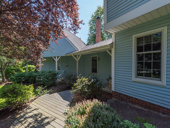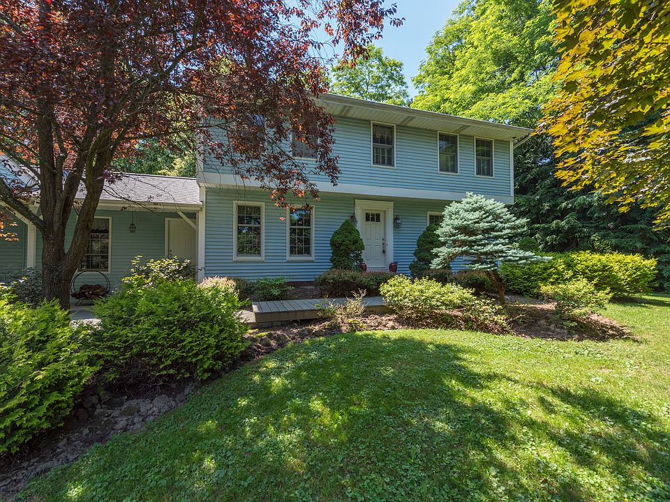 This Charming home is on over an acre and a half private wooded lot with garden area! Come unwind in this story book setting, can you picture yourself sitting on the front porch of this beautiful Colonial home... The home has a formal living room with a big picture window and custom moldings throughout. The cozy family room features a wood burning fireplace to cozy up to on winter nights with exposed and hidden bookcases. The updated kitchen, which is open to an eat in dining area, features granite counter tops, rich wood cabinets, hardwood flooring, and all kitchen appliances stay! A grand dining room has plenty of room for family gatherings and holidays around the table. The home also includes 4 spacious bedrooms, the 4th Bedroom with Bath, offers a Teen, In-law Suite or Studio space in it's own wing. The large Master bedroom features an ensuite with walk in closet and shower. The 2- tiered Deck overlooks the breathtaking view of the picturesque yard and is made of low maintenance trex material, along with the front walkway. This home has pride of ownership with many updates such as, a new hot water tank (1 year old), offsite septic with newer septic system, new apron, as well as, Andersen windows and doors, the roof is around 12 years old. The home is completed with a large 2 car attached garage and low utility bills!
