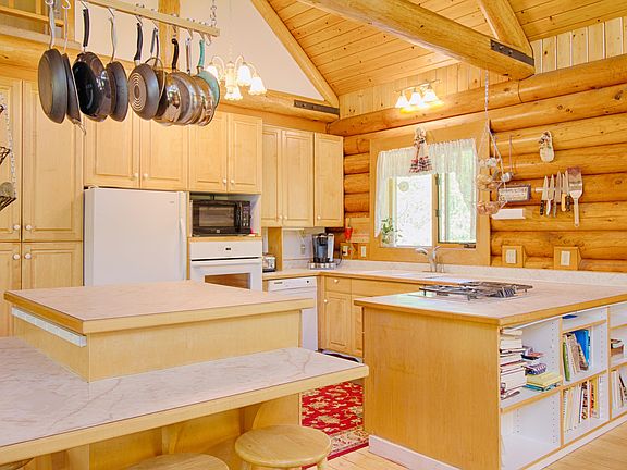 Beautiful and Solidly constructed large cedar log home on manicured grounds with trees bordering the property to provide privacy, and views of the mountains that don't quit. Established Fruit trees and raspberry bushes with plenty of room for a world-class garden. Also featuring an equestrian barn with 3 stalls and tack room, ready for new horses, as well as a shed, kennel, and a chicken house.