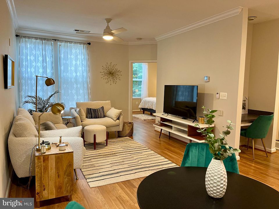 Bright 1 bed/1 bath in the Savoy at Reston Town Center, overlooking the quiet courtyard. Step right out to shops, restaurants, and movies. The unit's open living space features tall ceilings, big windows, and hardwood flooring throughout. Spacious kitchen with ample counter and cabinet space, a pantry, and a built-in desk. Sizable primary bedroom has walk-in closet and full bath. Washer and Dryer in unit. One garage parking spot right near the elevator. Additional parking spaces can be leased. Walking distance to the Reston Town Center Metro. Water Heater 2022. HVAC 2021. Enjoy all of the amenities the Savoy has to offer, with the lowest condo fees in the Town Center. This building has a game room, pool, fitness room, meeting spaces, computer center, secure entry with concierge, and a private outdoor area with gazebo. Seller is open to selling furnished, for a perfect pied-à-terre.
