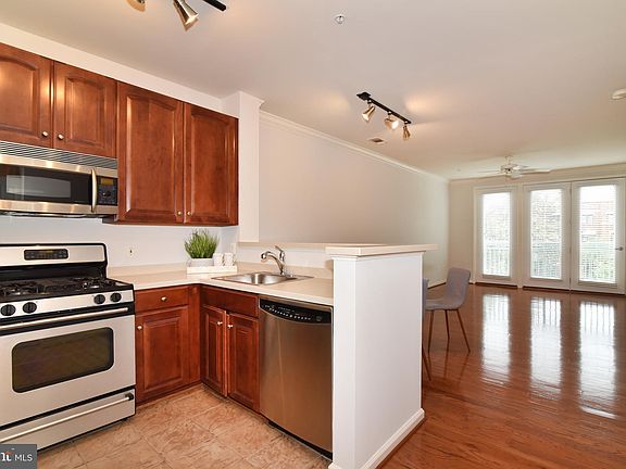 Immaculate condo with 9 ft. ceilings, hard wood floors and lots of light! Gourmet kitchen featuring 42" cherry cabinets, gas cooking, Corian countertops and stainless steel appliances. Large bedroom with huge walk-in closet. The built-in desk area is perfect for working from home. Front hall closet. Washer and Dryer in unit. All the convenience of first floor access, but this unit is not on the ground level. It sits one level above ground on front corner of building. Unit has been freshly painted for new owner. Reserved, garage parking spot under building. Market Street at Town Center features secure entry, concierge, AMAZING outdoor pool, business center, community room, and fitness center.. Walk to everything Reston Town Center has to offer plus the W&OD Trail, Hospital, library, and new Metro stop due to open 2022. Floor plan and building layouts are in Documents section.
