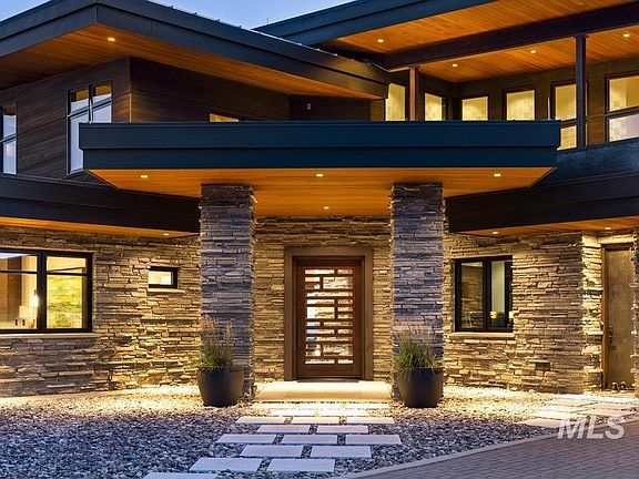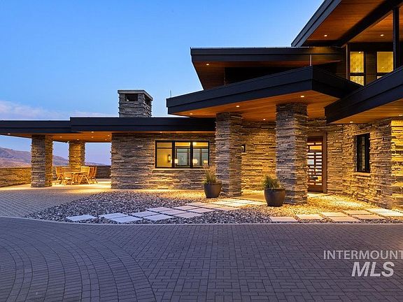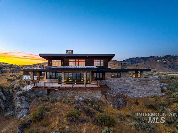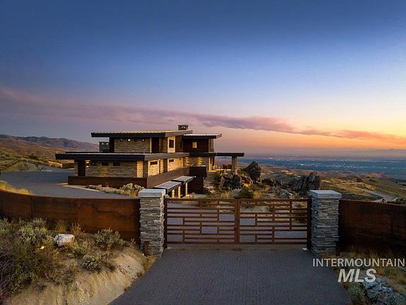 Experience a harmonious blend of nature and architecture -- a secure sanctuary for those who live in it. This iconic 4-bedroom, 5.5-bath residence crafted from Corten steel and Oakley stone is seamlessly integrated with its spectacular natural setting. Situated on 4.72 acres beneath a stunning mountain backdrop, it offers 360-degree vistas of downtown, city lights, our foothills, and distant ranges. This architectural treasure features retractable glass walls, warm white oak paired with heated limestone floors, and soaring ceilings. The connoisseur’s kitchen, ensuite bedrooms, executive office, movie theatre, gym, and detached shop/ADU fulfill every desire. Enjoy quite moments or entertaining in serene outdoor spaces. Equipped with energy efficient solar, a private well, and low maintenance landscaping, this immaculate home embraces beauty, efficiency and sustainability. Just 20 minutes from downtown Boise, Bogus Basin Mountain Resort, & top-rated schools, this is a rare transformative lifestyle opportunity.