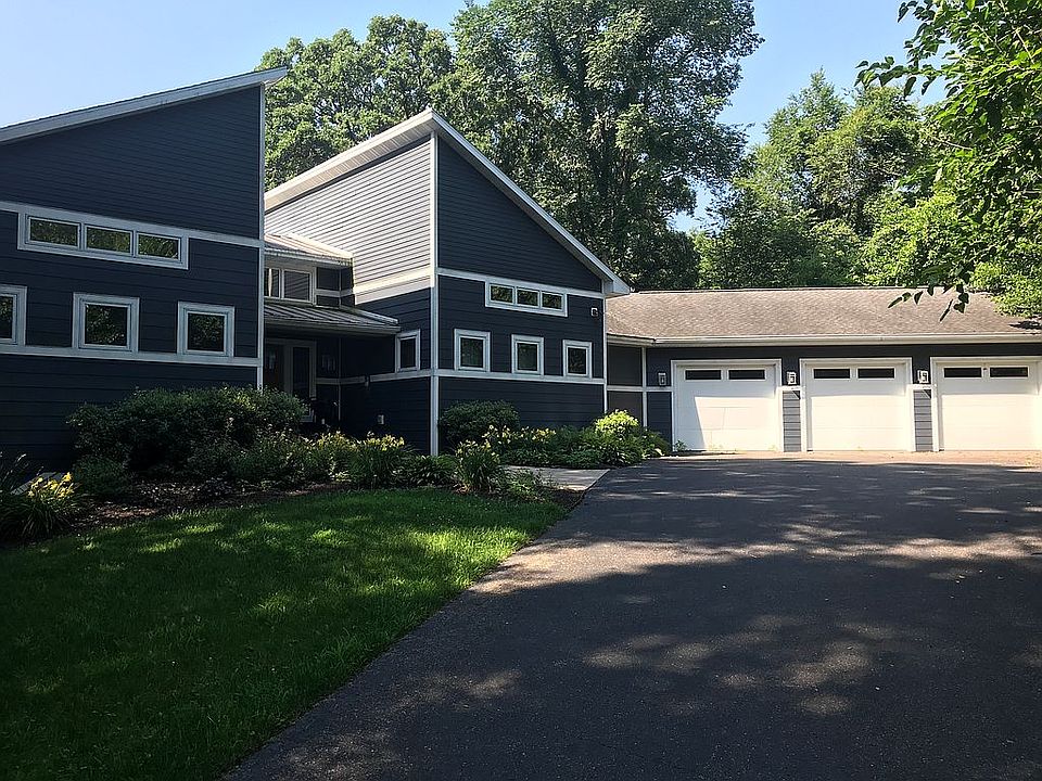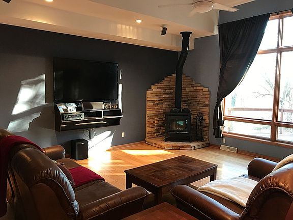 Secluded 4 Acre Wooded Single Family Home. The exterior of the house has fiber cement siding and large 3 season porch with composite deck. The interior of the home has 3 bedrooms and 2.5 baths. Main floor of the home has a large open kitchen/great room area with stainless steel appliances, breakfast bar, walk-in pantry, and granite counters. The living area has a wood burning stove and built in surround-sound system. The master suite has his/hers walk-in closets with built-in storage, walk-in tile shower, and a double vanity. Main floor also contains mudroom with built in cabinets, half bath, office space and laundry area. Lower level is finished with a large family room/play room area, two bedrooms and full bath with tub/shower and two vanities.