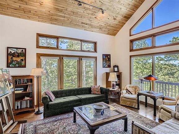 Discover unparalleled contemporary mountain living with "Top-of-the-World" views of the Continental Divide. Nestled in a nearly six-acre tranquil and private enclave, this property embodies a promise of tranquility, seclusion, and an escape from urban hustle. A hidden gem conveniently located near Denver and Boulder. Stunning 5-bed, 4-bath, 3800 sq ft home with sweeping panoramas of snow-capped mountains, wildflowers, rock formations, and an open painted sky reflecting nature's many moods. The great room exudes sophistication with its exquisite hardwood flooring and a ceiling adorned with stunning wood inlay. Chef's dream kitchen is equipped with top-of-the-line appliances and generous granite counters for both preparation and entertainment. The expansive primary bedroom suite, complete with a double walkout deck, invites you to awaken to awe-inspiring views each morning. The primary bathroom features double sinks, a lavish soaking tub, and a shower. Boasting five large bedrooms and four bathrooms, this residence offers abundant space for guests. Immerse yourself in the natural surroundings from any of the five decks, each providing an ideal setting for indulging in your morning coffee amidst sunrise hues or eating dinner and sipping wine as the sun sets on the horizon. The fully finished walkout basement expands the living space, presenting additional bedrooms, a living area, and a bathroom for utmost comfort and convenience. The exceptional nearby Coal Creek Canyon K-8 School is less than 3 miles away. Surrender to the tranquility and panoramic vistas that define this contemporary mountain sanctuary. Enjoy the videos, and request a private tour to see this pinnacle of mountain living, where every moment is framed by the majesty of nature's finest artwork. Amenities; shopping, restaurants, gas at Candelas in Arvada, approx 25-min drive, 35-min to Boulder, 20 miles to Eldorado Ski Area, 1-hour to DIA, 50-min commute to Downtown Denver.