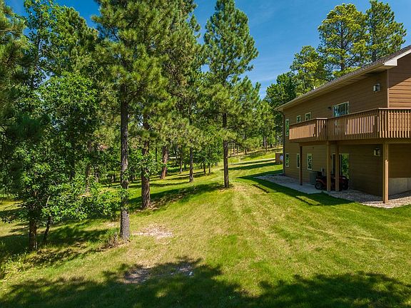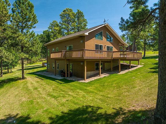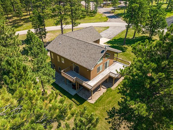 Amazing opportunity to own this well crafted home in the coveted Meadow Crest Subdivision. As you drive through the neighborhood, you can feel the care the association has taken over the years. The abundance of green spaces and mixture of trees bring the sense of the Black Hills right to your door. The home sits on nearly 3 acres covered in both pine and oak trees, with outstanding outdoor spaces available for your enjoyment. The absolute best feature this home offers is 90 linear feet of decking with a total of 690 square feet wraped around 3 sides of the home, overlooking the pine covered acreage that comes with the property. The sliding walkout door in the basement also features fantastic views of the yard and an 8x12 patio. The quality products and workmanship are easy to spot as you walk through the home. The 6x11 foyer features tiled flooring and the great room offers true hard wood floors. There are 2 rocked, gas fireplaces one in the main living area and one in the basement family room. The main living area is open concept, with an abundance of windows for nautral light. Again bringing the Black Hills into your home with the towering trees & sky visible on all sides. The open stairway leads you to the nearly finished basment which is only missing flooring and a few woodworking touches. Some trimwork/doors are still in the home waiting to be used on the finished product! The basement has 2 additonal bedrooms that are generously sized & a 5x13 nook off the family room.