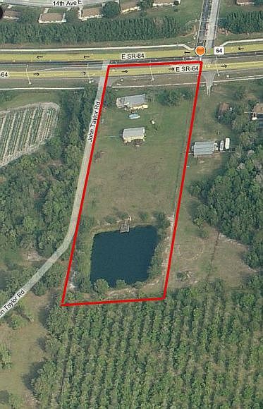 Endless Opportunities in the "Path of Progress". High visibility with turn around right on SR 64 backing up to new Lakewood Ranch development, Eagle Trace. Potential rezones for PD-R, PD-C, UF-3 & OPI. Could be bank, strip mall, professional park, recreational facility, future commercial or residential development the list goes on. Just under 5 acres with approximately 1 acre spring fed lake at back of property. 4 bedrooms, 2 bath house and stables convey with land. Could have access roads on side of lot.Why not buy today, greenbelt property, rent house...develop later?