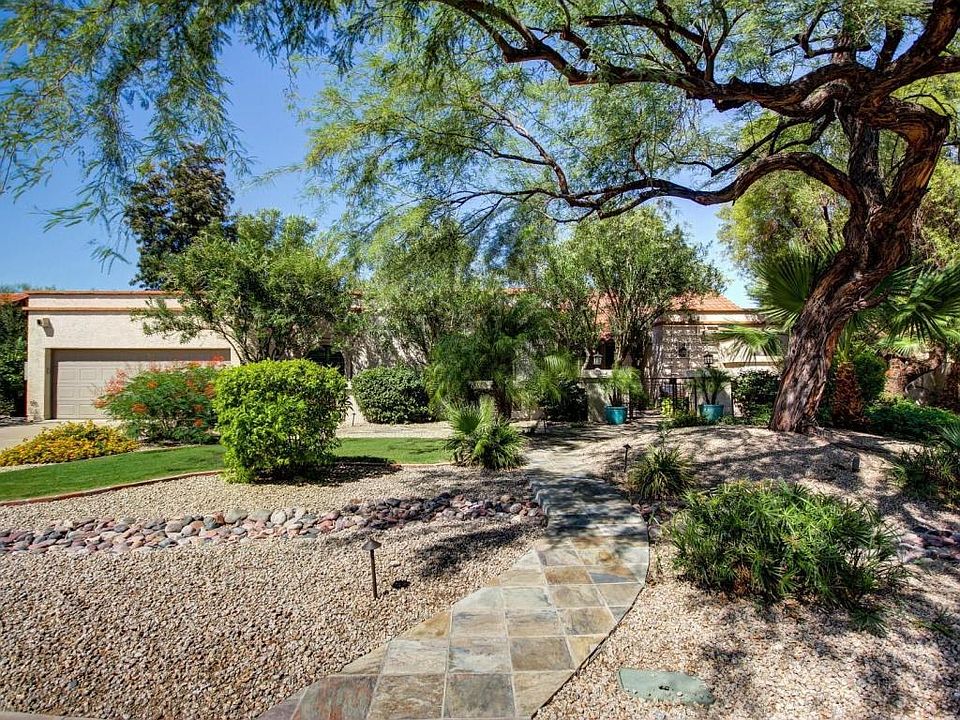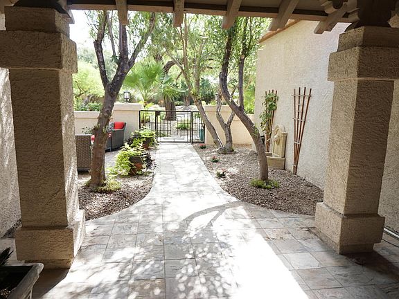 This home is truly paradise starting with the walk through the enchanting front yard with mature trees and relaxing courtyard as you enter the home. This elegant Scottsdale home will knock your socks off with over 100K in recent upgrades including all new Low E windows & doors throughout the home. Beautiful wood/Travertine flooring, French exits, coved ceilings, wide shutters & skylights. Formal living room has a sleek fireplace and arched passageway to the dining room. Large remodeled Kitchen with new appliances, pantry,& sit up island opens up into a huge family room area. Enjoy the warmth of this newly remodeled family room gas fireplace, high ceilings, light cove,& wine bar. Master suite has sitting area, private exit, 2 walk in closets, dbl sinks, whirlpool tub, rain shower.