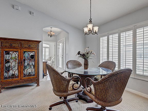 Welcome to this furnished, turnkey 2-bedroom + den home in the gated, 55+ Wellington at Seven Hills community. As you enter the home, a spacious foyer leads to double doors opening into a versatile Den/Media Room/Office, with a large Great Room/Dining Area featuring vaulted ceilings and architectural arches. The home boasts high ceilings, ceiling fans, plantation shutters, and an oversized lanai. The eat-in kitchen offers abundant cabinetry, under-cabinet lighting, a pantry, and Bosch appliances (microwave and dishwasher less than a year old). The large master suite includes a walk-in closet and master bath with a walk-in shower. The second bedroom, conveniently located near the second bath, is perfect for guests. Additional highlights include a 1998 EZ GO Textron Golf Cart, a laundry room with built-in storage, and a roof replacement scheduled for 2025/2026 by the association. The 18,000 sq. ft. clubhouse features a ballroom, restaurant, billiards, fitness center, library, heated pool, spa, and bocce. Enjoy walking on well-maintained sidewalks through lush landscaping, with HOA fees covering lawn maintenance, exterior painting, sprinkler system, roof replacement (1x), internet, and cable. Located just 15 minutes from the Suncoast, this home is also close to beaches for boating, kayaking, fishing, and nature trails. Move in, unpack, and start living your dream lifestyle today!
