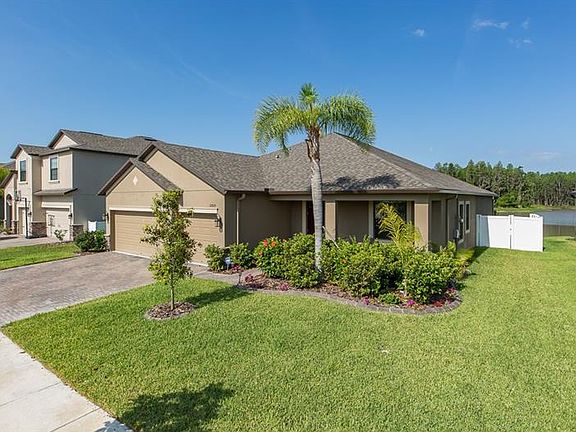 WHAT A VIEW! This 4 bedroom, 3 bathroom, 3 car garage home sits on an amazing premium waterfront lot. As you come through the front door, the volume ceilings enhance the already open floor plan. With diagonal tile throughout the main living area, which makes it easy to keep clean! The formal living and dining room lead into the kitchen and family room. The kitchen has 42 inch espresso cabinets, quartz countertops, plenty of cabinet space, and an island for bar stool seating. The bedrooms are set up as a triple split plan with 2 full guest bathrooms. The large master bedroom has a spacious walk in closet and a lovely bathroom with double sinks, granite counters, a large shower, and garden tub. And now THE VIEW... off the family room, master, and one of the bathrooms is access to the screened in covered patio. Enjoy the stunning sunsets and lake view all year round! This home is located in Trinity Preserve a very desirable gated community with low HOA and NO CDD! Zoned for A+ schools, close to shopping, restaurants, and the Suncoast Parkway. Call for a showing TODAY!