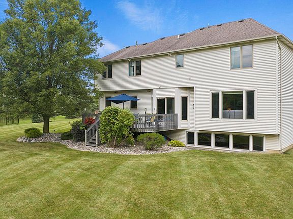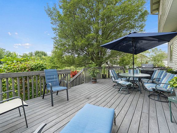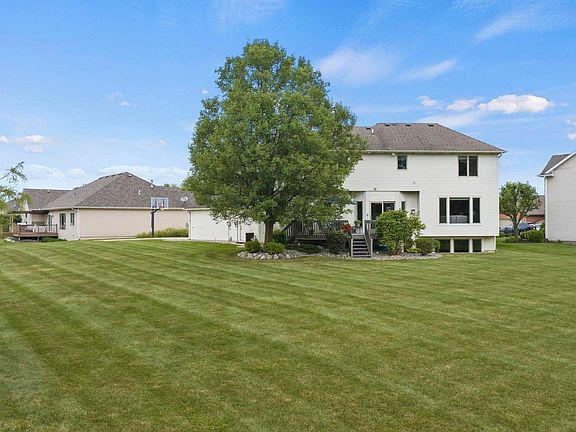 PRICE IMPROVEMENT! This beautifully maintained 4 bedroom plus office, 5 bathroom brick and vinyl home sitting on over a half an acre, irrigation system, complete tree-lined private oasis is a dream come true! Built by Bob Buescher, this home offers an open floor plan with large windows offering picturesque views & a double sided gas fireplace. The large kitchen pantry is an added feature with a countertop, outlets a for a coffee bar & out of site convenience in addition to a beautiful open kitchen. You'll love the convenience entering the mud room off the garage and two laundry rooms that make everyday life effortless. Retreat into the main bedroom and enjoy “two walk-in closets” and an oversized tub! There is ample storage including attic access from the garage or second floor. Take advantage of summer days on your Trex composite deck as your own private oasis or entertain guests at the built in bar located in your lookout basement! With 3 car side load garage you can store all vehicles safely away while still having plenty of room for outdoor activities. Don’t miss out on this beautiful property – come take a look today! An added bonus a association pool & tennis court!