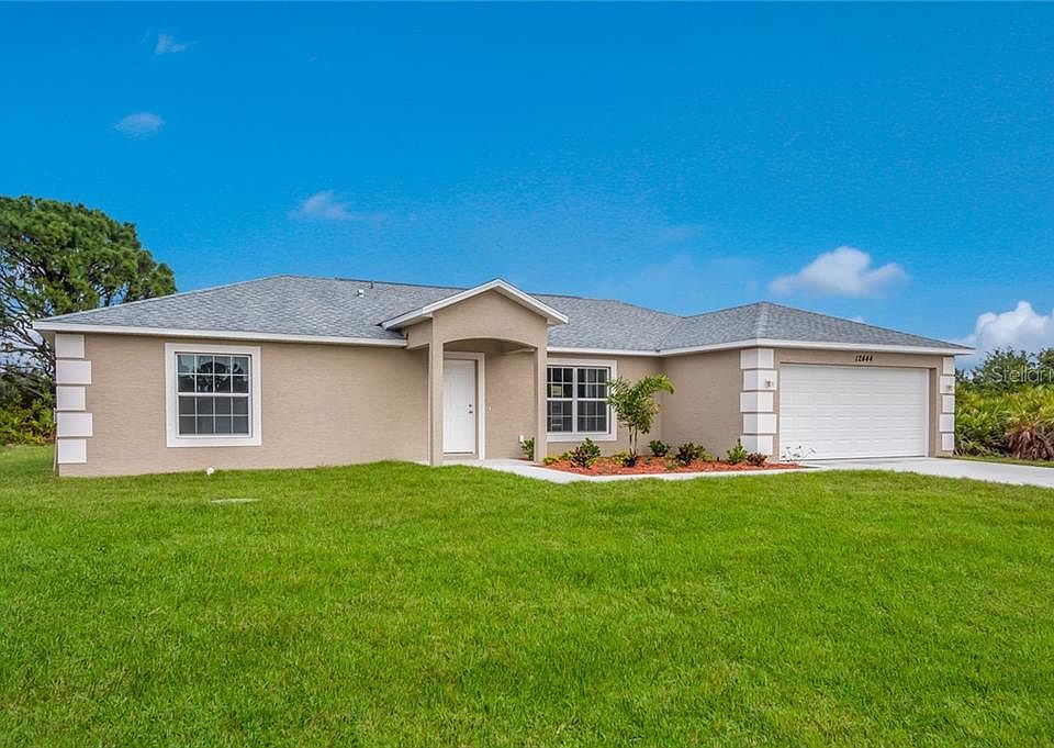 Under Construction. NEW CONSTRUCTION Concrete block stucco construction with a hip dimensional shingle roof. Not in a Flood Zone !! Built to the latest hurricane and building codes making insurance inexpensive! Split, open floor plan, 3 bedrooms, 2 bathrooms, and a 2 car garage on central water In Englewood! This home has tile flooring throughout, cathedral ceiling, ceiling fans in each room, and French doors from the dining area onto the porch! Granite countertop in both Kitchen and Bathrooms, breakfast bar, and comes complete with a full stainless steel appliance package. Located within minutes of the beach, shopping, restaurants, and great fishing! Minutes from shopping, golfing, dining, beautiful beaches and world class fishing. Photos are from a similar model, colors may be different.