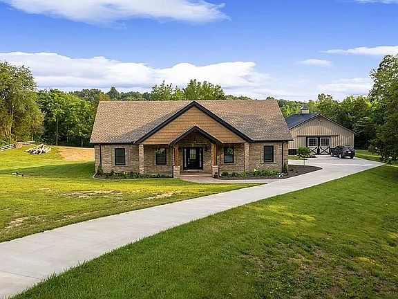 Jefferson County, Indiana home back on the market with 3.2 acres and a pond. Custom built 3 bedroom, 2 full bath, 1 floor brick home. 2 covered porches, attached garage, 36x40 Morton building with Cupola double sliding doors. Hardwood flooring, eloquent trim, custom showers and custom lighting. Scenic, secluded partial fence and pond. One owner home. Concrete driveway. Beautiful home surrounded by 350 vacant acres.