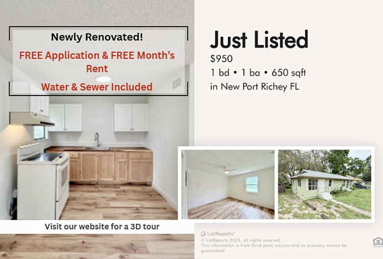 FREE APPLICATION & FREE MONTH'S RENT Beautiful 1 bed 1 bath is available for rent in New Port Richey with 10 Stars Property Management Welcome to your serene escape at 12005 Wanda Avenue in New Port Richey, FL! This charming home is tucked away in a quiet neighborhood yet perfectly positioned for adventure, just minutes from the crystal-clear waters of Werner-Boyce Salt Springs State Park, top-rated kayaking spots, and the vibrant shopping and dining of downtown New Port Richey. Enjoy easy access to beautiful Gulf beaches, golf courses, and the popular Starkey Wilderness Preserve for hiking and wildlife watching. Whether you're craving nature, nightlife, or a peaceful retreat, this location offers the best of all worlds, come experience Florida living at its finest! 3D Virtual Tour: Click Here to Explore Features: - Application fee will be credited back on the 1st month of rent if approved - Vinyl flooring throughout for durability and easy maintenance - Basic kitchen appliances for cooking convenience - Classic wood cabinetry offering timeless style and ample storage - Ceiling fan for added comfort and airflow - Bathtub and standup shower for versatile bathing options - Patio area perfect for relaxing, entertaining or enjoying outdoor dining - Spacious fenced backyard offers plenty of shade, making it the perfect spot to relax and enjoy the outdoors year-round - Water & Sewer included - Tenant is responsible for paying trash and power Pets are allowed. No more than 2 pets per property. Weight limit of 55lbs per pet. No aggressive breeds. Applicants must complete a free pet application and have animal approved with vaccination record. The monthly pet fee will be determined by your pet screening score. Does not apply to medically/emotional support prescribed and/or service animals. Every applicant 18 years of age or older is required to complete a separate application. Each application is a $65 non refundable fee. A credit and background check will be conducted for all applicants, and management approval is required prior to signing the lease. All residents are automatically enrolled in the 10 Stars Resident Benefits Package at a cost of $7.99 per month. This program was developed to enhance the overall rental experience by providing added convenience, protection, and value throughout the lease term. Enrollment is required and cannot be waived. The package may only be initiated at the time of lease signing or renewal and includes a range of benefits designed to promote a more efficient, flexible, and secure tenancy. Renter's insurance required prior to move-in. At 10 Stars, we offer multiple services to make your stay with us easy and comfortable. We have a same-day application approval and a quick move-in for no additional cost. Our team is professionally trained and will be able to assist with any leasing, billing, or maintenance issues our tenants have. We also offer an emergency line available 24/7 for any urgent cases. Tenants have access to an online portal where they can make rent payments, communicate with our team and get updates on their payments and maintenance requests at all times.