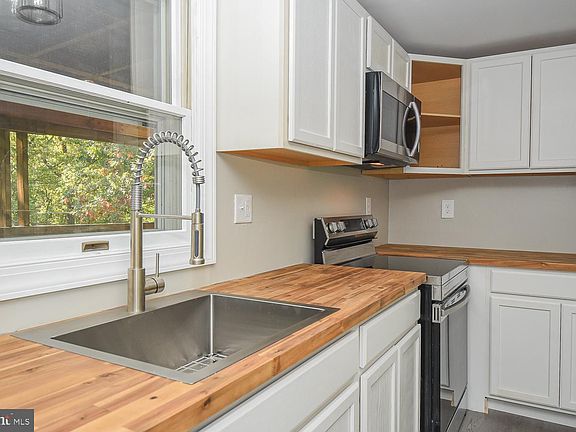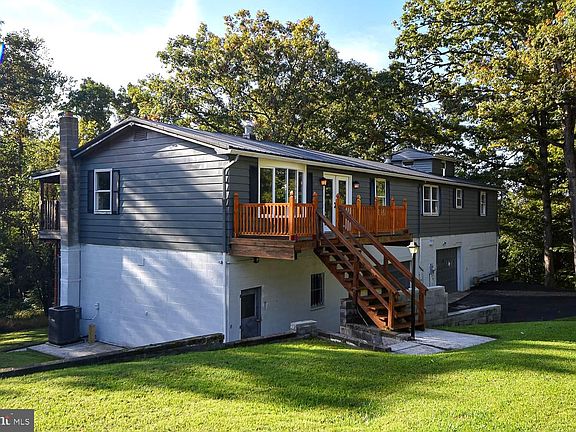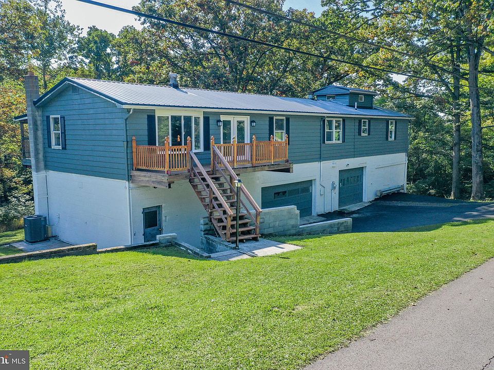 This fully renovated, block-and-steel-beam, 1980-strong home totals 4000 sq ft, with 2000 sq ft on the main level. This spacious and luxurious 3 Bedroom, 3 full bath home sits in Bowman's Addition, Allegany County, just outside Cumberland, MD city limits. A french-door entry from a large front-deck leads into a bright living room with a bay window. The 500 sq ft Primary Suite offers an office/sitting room, loft, walk-in closet, bedroom, and porcelain-tiled bath with free-standing soaking tub and 48 in walk-in shower. Two hall bedrooms are across from a porcelain-tiled hall bath with soaking tub/shower combination. The eat-in kitchen includes new stainless steel appliances, butcher block countertops, and cabinets. The nearby pantry/utility room includes a vanity sink and plumbing/electrical for a main-level washer and dryer. The formal dining/family room looks out onto the large, covered 60-foot-long back deck and backyard. The main level has new vinyl plank flooring, fixtures, and LED lighting throughout. The basement has a two-car garage and a second garage with an oversized 9-foot-high entrance, as well as a large space for a gym and/or mower/ATV parking, all with 12-foot-ceilings. The basement recreation room has an outside entrance leading to the front patio and an updated third full bathroom with shower enclosure. Perimeter trees and a nearby creek add privacy to the nearly half-acre lot. Additional upgrades include metal roof, electrical panels, and hot water heater top off this renovated home, with central A/C and new baseboard heat and forced air heat pump (with an as-is wood/coal furnace) and county water/sewer (with a supplemental as-is well).
