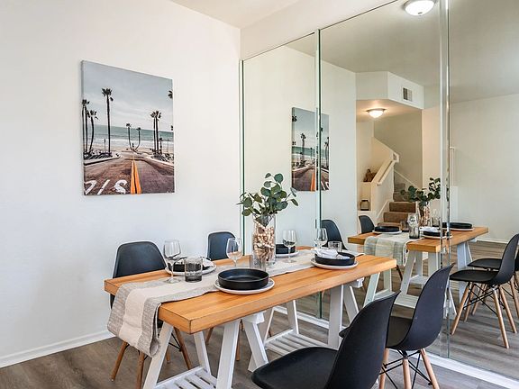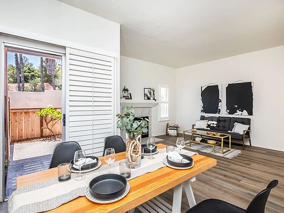 Beautifully Refreshed Townhome, just over 20 minutes east of downtown San Diego. Nestled between mountains with views from the windows of both exterior patios and the primary suite. New flooring, fresh paint, updated lighting and fixtures through out, bringing a clean and modern vibe, while allowing for more upgrades in the future. This townhome offers a large amount of square footage, private garage, and loads of guest parking throughout the complex. The primary and secondary bedrooms are upstairs, have large vaulted ceilings and architectural features and each has their own on-suite baths, basically two primary suites, or one primary suite and an outstanding extra large office space. The downstairs area has a living dining combo, 1/2 bath, and fenced exterior patio - perfect for pets with a small area for gardening. Multiple pools in the complex, low HOA fees, and many other amenities in the area make life easy without even having to travel. The exterior patio off the primary suite faces the mountains, has enough room for a bistro patio set and is a perfect spot for a morning coffee while watching the sun rise. This is a great opportunity for a starter home in San Diego while having easy access to freeways and surface streets with loads of restaurants, shopping, and outdoor activities nearby.