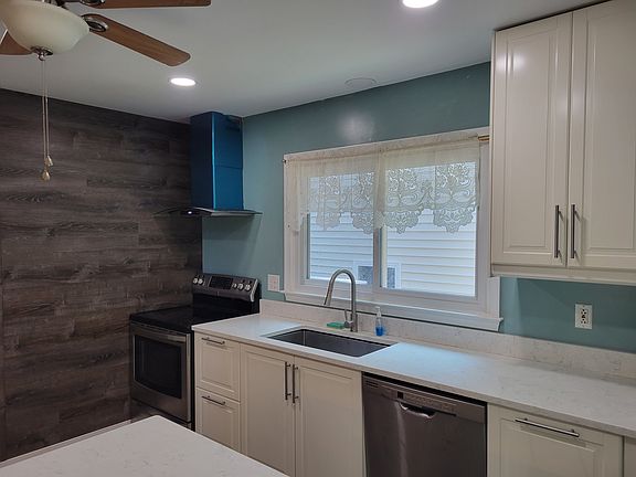 New lvp flooringTastefully remodeled kitchenQuartz counter topsOversized rear deckStainless steel sink