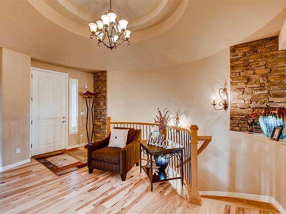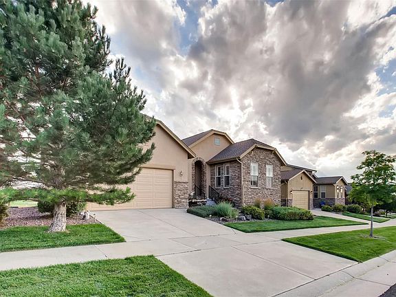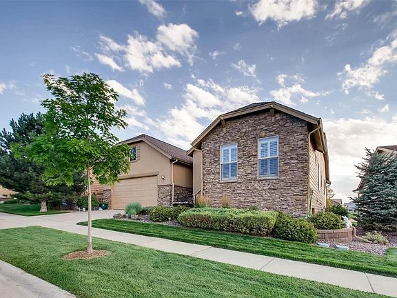 Spectacular setting with sweeping views of our Rocky Mountains and Black Bear Golf Course. This walk-out ranch home is in the sought-out section of Heathstead built by the original Village Homes. Absolutely no upgrade was spared: custom texturing 5" plank hickory flooring on entire main floor, custom hardware, custom built-ins and exposed beams in great room, plantation shutters throughout. Beautiful gourmet kitchen with upscale cabinets and triple crown molding. Master bedroom has coffered ceiling and laundry room access from walk-in closet. The builder-finished basement has: hickory hardwood floors, huge family/party room with elegant wet bar and custom fireplace, two conforming bedrooms, 3/4 bath and two big storage areas. There are unobstructed views of the 15th fairway and mountains from the main level and basement. Carefree living with HOA maintained exterior (except roof), yards and snow removal. Very easy access to transportation and the Tech Center.