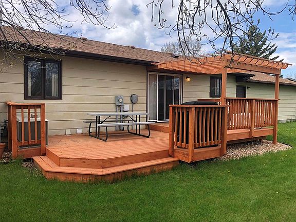 SW location in a quiet cul-de-sac near Dakota Square Mall, YMCA, restaurants and banks. Spacious kitchen and dining areas. Large master bedroom, sunken living room, large jetted tub in main bathroom. New kitchen cabinets and counters, microwave, vinyl plank flooring and carpet in living room and hallway. Newer shingles, insulated garage doors, furnace, ac, water heater and range. Lower level is mostly unfinished and features a nice 3/4 bath and laundry area. Open for future basement plans! The premier feature of this property is the large (308 sq ft ) deck over looking the spacious backyard that features many apple trees(harold), spruce trees and nice lilac hedge. Over 1/3 acre also claims professional landscaping around the perimeter of the house., two garden spots, sitting area and small pond. Plenty of potential for future expansion.