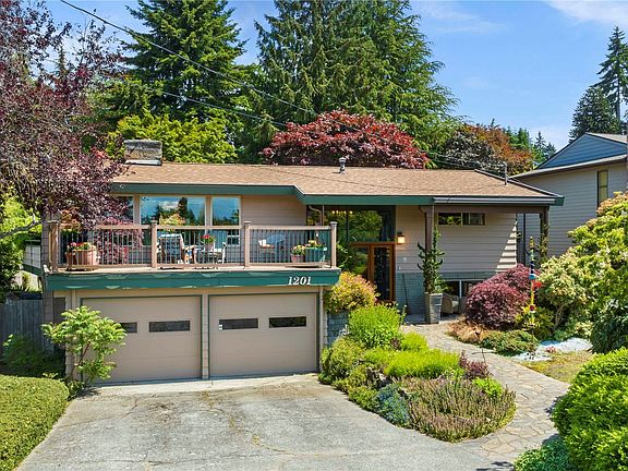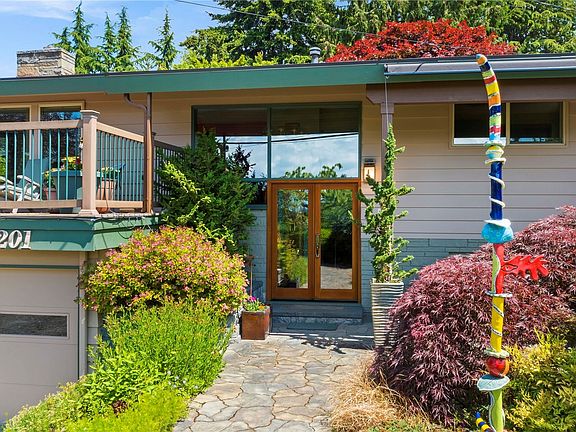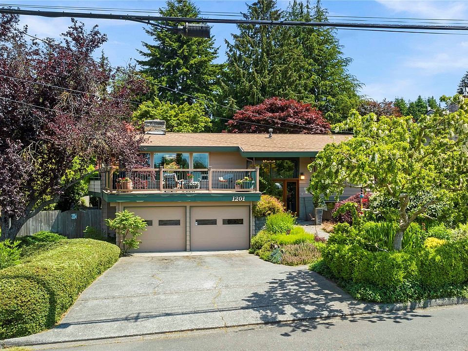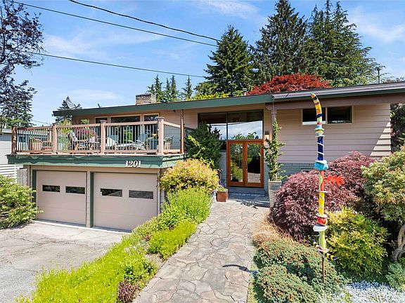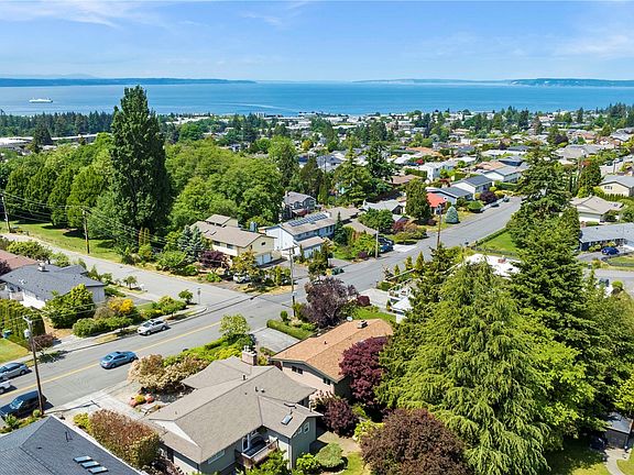 Unique home with level entry and circular stairway featuring mahogany banister and railing. Open floor plan where living room flows into dining, kitchen and sunroom with heated ceramic tile, and floor to ceiling windows overlooking the park-like garden. Upgraded kitchen with abundant storage and skylight. Mahogany trim throughout. Large wraparound deck leads to westerly Olympic Mountain views and peek-a-boo sound views to the North. Additional multi-level deck in backyard plus two covered patio areas for outdoor enjoyment on rainy days. 5000 watt heater in garage, used for Pottery Studio. If you love gardens do not miss this place! Very private back yard designed with creative walking paths. Extra bonus- backyard play house.