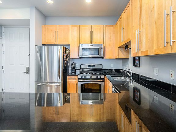 Come see this beautiful one bedroom with balcony at the coveted Upper Grand! The west facing balcony gets lots of light and overlooks the serene and beautifully maintained courtyard. Gorgeous kitchen boasts stainless steel appliances, dual sink with disposal, 42 inch cabinets, and granite counters with over-sized breakfast bar. Spacious home includes hardwood floors throughout, central air and heat, 9 ft ceilings, and washer/dryer in unit. There are 3 closets for ample storage, including a large walk-in-closet in the bedroom. The building is located just across from the pop up park and only a few blocks from Trader Joe's. This home is close to the NYC bus and ferry, as well as great bars, restaurants, spin/yoga classes, the movie theater and so much more! The steel and concrete building is expertly maintained and features a bright fitness center complete with a Peloton bike as well as a large community room and shared courtyard. Garage parking space is included. (If rented without parking, rent will be $2650) Broker fee and credit check apply. Pets may be considered at landlord's discretion. Available for November 18th-23rd start date. Credit check and broker's fee apply