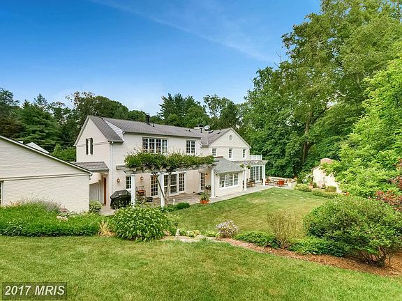 Gracious light-filled colonial at end of quiet rd next to greenspace w/stream & woodlands. Fine finishes, exposed beams in DR & LR w/FP, main level BR/BA, elegant MBR ste, white eat-in kit opens to FR w/FP. Sunrm w/coffered ceiling & wetbar opens to expansive terraces w/sitting walls, firepit, remarkable landscaping, level lawn for play. Historic 1800 log cabin is home ofc. Premier Ruxton location