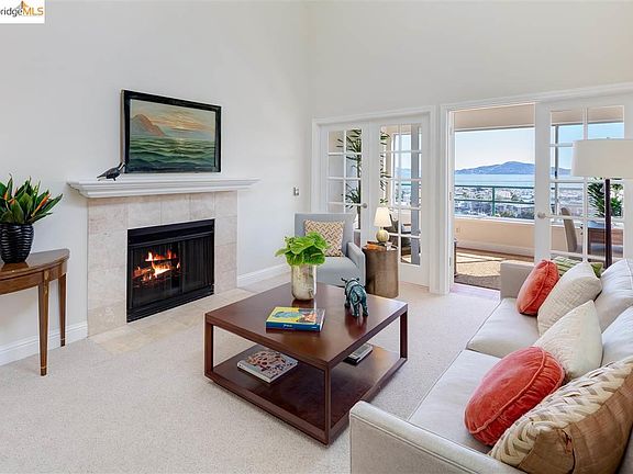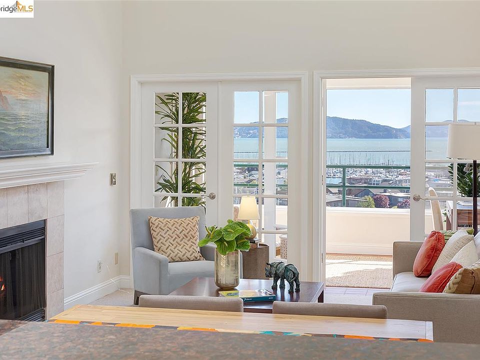 Enjoy stunning views, dramatic cathedral ceilings & ideal separation of space in this coveted penthouse level condo! Brickyard Landing is known for its resort-style amenities, beautiful grounds & wonderful location right across from the Marina.This 2/2 unit enjoys a tiled solarium with remarkable views: Mt. Tamalpais straight out your window! Interior has been freshly painted, & new wool carpeting installed. Entry, baths & kitchen sport travertine tile, as does the hearth around the wood-burning fireplace with new mantle. Updated kitchen with granite counters & natural wood cabinets. Full-sized washer/dryer within the unit. Baths have been upgraded to offer extra storage, plus an office nook as part of the primary suite, along with a walk-in closet. High ceilings & big views in the primary suite create a dramatic sense of spaciousness. Special upgrades: 4 Solatubes bathe this unit in light! 2 secure parkings+ storage, EV chargers & community gardens are all part of resort-style living!