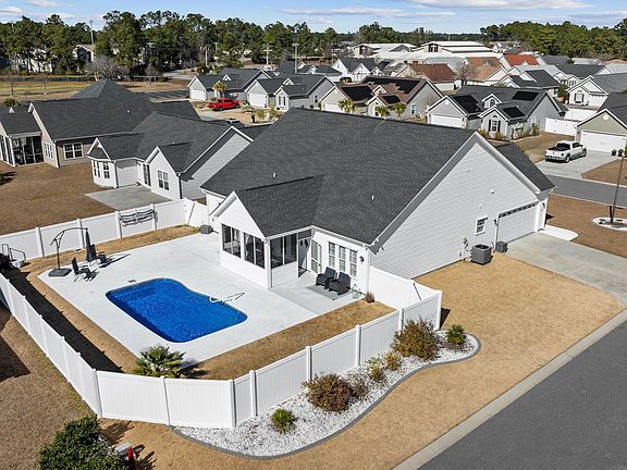 Welcome to this meticulously maintained, better than new, upgraded galore home in Surfside Beach, South Carolina. This home has curb appeal from the start with a side load garage, extended driveway and low maintenance landscaping with river rock and Curbscape. In the spring the grass will come back to life and be the supersod, TifTuf Bermuda golf course grade grass on the side and Zoysia inside the fence. Walk through the front door down the foyer and be greeted by the large living room that is open to the kitchen. The living room has a double tray ceiling, extra can lighting, and large ceiling fan. The kitchen has granite countertops, plenty of soft close cabinets with sliding racks inside, tile backsplash, pantry, and pendant lighting over the large breakfast bar. This home is great for entertaining, the dining area currently holds a table for 8, but could fit an even larger table comfortably. The owners' suite is toward the back of the house and has a tray ceiling, accent wall, tile shower with seat and glass door, double sink, double walk-in closet, and linen closet. This is one-level living at its finest with the other 3 bedrooms bedrooms at the front of the house. Each bedroom has its own ceiling fan, spacious closet and they share a bathroom that has a tub and shower combination. The laundry room has a side by side washer and dryer, extra cabinets, a utility sink, and plenty of other room for a drop area when you come from the garage. The garage does not feel like a garage with it being insulated and the coating on the floor. The pull down stairs to the attic are in the garage and the attic has plenty of room to fully stand up and it extends to the width of the kitchen. Last but not least is the outdoor oasis. The 9'4" x 14' screened porch is completely private with pull down UV shades and surrounded by the pool and vinyl fence. The patio flooring is extended outside and leads to the 14'x25' salt water, fiberglass Barrier Reef swimming pool! It just got a brand new pool pump in 2023. It is getting a new fiber glass coating in just a couple weeks so it will be like new. It is low maintenance and gets plenty of sun all day long. The fence is great for complete privacy and for pets. There is a 5 zone irrigation system that makes taking care of the plush grass easy. Other features of this stunning home is the Plantation Shutters throughout, gutters, hurricane shutters, pressure assisted toilets, remote thermostats and sensors, new Pergo flooring in the main areas and plush carpet in the bedrooms, lever handles throughout, a storm door, and a brand new HVAC system in 2023 including the heat pump, air handler, and ductwork. Located in the quaint neighborhood of Mallard Landing Park it literally is a golf cart ride to the beach! It is centrally located between Highway 17 Bypass and Highway 17 Business and in the heart of Surfside Beach. The beach, pier, dining, shopping, grocery stores, countless golf courses, entertainment, healthcare and more just a short drive away. This home is move-in ready, immaculate, and ready for you to enjoy this lifestyle. You have the best of both worlds here, a private pool and golf cart ride to the Atlantic ocean. Schedule your showing of this one of a kind home today!