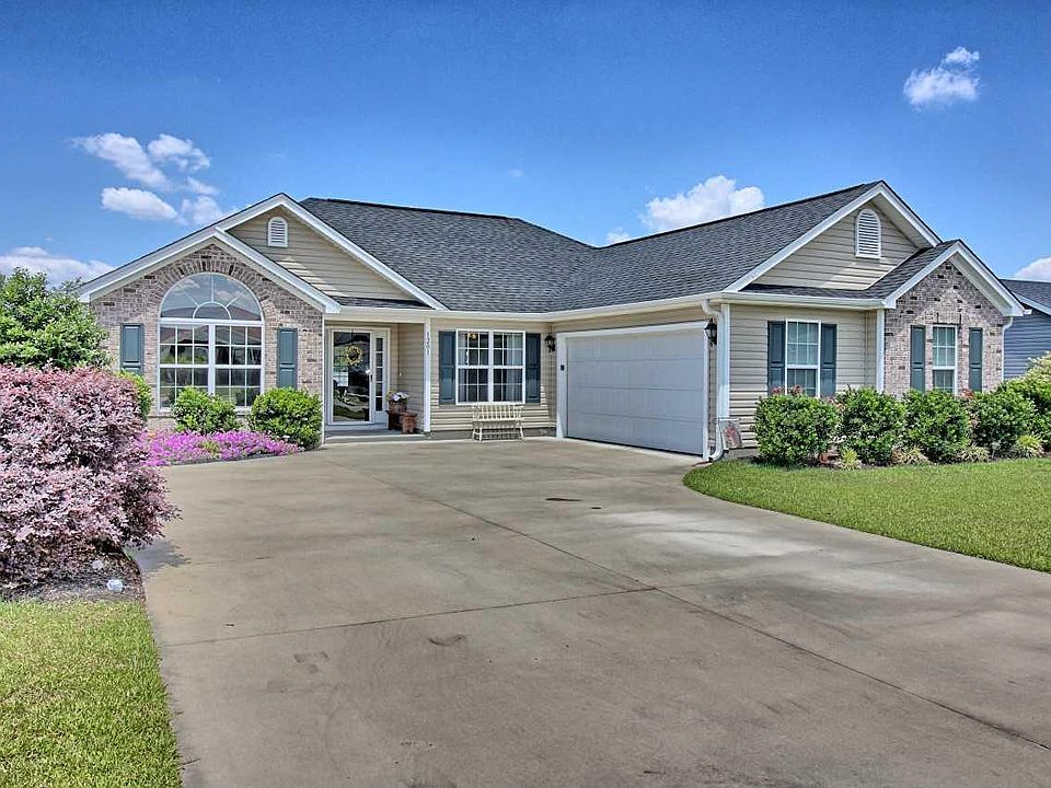 Immaculate, three bedroom, two bath home with two car side load garage situated on a large corner lot with circular drive. NO HOA FEES! Boasting stainless steel appliances, breakfast bar, breakfast nook, formal dining, open floor plan, vaulted ceilings, plant shelves, recessed lighting, hardwood floors in living area, master bedroom with tray ceiling and ceiling fan, master bath with double vanity and large shower, custom window treatements, pocket doors in living room, laundry room and master bathroom, security system and neutral color paint throughout. Exterior features include a large screen porch with tile flooring, large patio, fenced yard for privacy, storage building, irrigation system, garage offers cabinets and counters identical to the kitchen for storage and work area. Beautifully landscaped with great curb appeal. Situated in a quiet community just minutes from all the necessities, shopping, dining, healtchare, attractions, golf, marinas, schools, River Walk, Waccamaw River, entertainment and just a short 30 minute drive to the white sandy beaches of the Carolina Coast and all that the Grand Strand has to offer. All measurements and square footages are approximate and not guaranteed. Buyers are responsible for verification of all information.