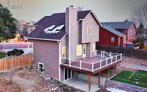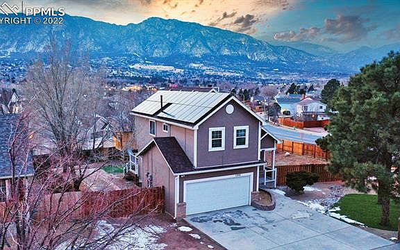 WELCOME HOME to your Colorado dream! This adorable tri-level home in Cheyenne Meadows features 4 bedrooms, 3 baths, and a 2 car garage. Adorned with a newly built, custom, composite wood deck with breathtaking mountain views on a bright, sunny .29 acre corner lot. This home is newly painted inside and out, with recently updated windows, roof, furnace, driveway, deck, and solar panels! The walk-out basement has a large sitting area that would make a great home office or gym. The main level wood-burning fireplaces add warmth on cold winter nights with views of the Rocky Mountains. The backyard is fenced and extremely private with RV parking, a wonderfully crafted treehouse, and a large shed. Close to Fort Carson, shopping, and Downtown in a very sought-after neighborhood. Home is move-in ready and can close quickly. This stunning property is move-in ready!!!