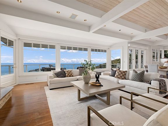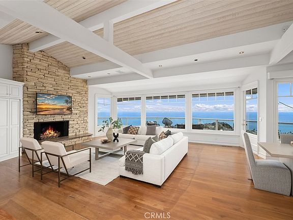 Panoramic ocean, white water views from this charming three bedroom, plus den and gym Craftsman home nestled at the end of a quiet cul de sac in Emerald Bay. Light and bright throughout. Main floor primary bedroom with beamed ceiling, built-ins and fireplace. Open great room concept also with beam ceilings and stacked stone fireplace. Gourmet kitchen with granite counters, two ovens including Café 30" built-in convection French door double wall oven, commercial grade cooktop, oversized island open to dining/great room with 180 degree sit down ocean views. Wood flooring and brand-new carpeting throughout. New roof. Large wrap around entertaining ocean view deck on both levels. Formal dining or family room with fireplace and built-ins. In-home office with vaulted ceiling, fireplace and custom built-ins. Oversized two car garage with built-ins. Lower level offers two bedroom en suites (one is oversized) with ocean views. Separate gym with its own entrance. The private cul de sac location coupled with unsurpassed ocean views make this home an exceptional opportunity to live and enjoy the lifestyle offered by the coveted community of Emerald Bay.
