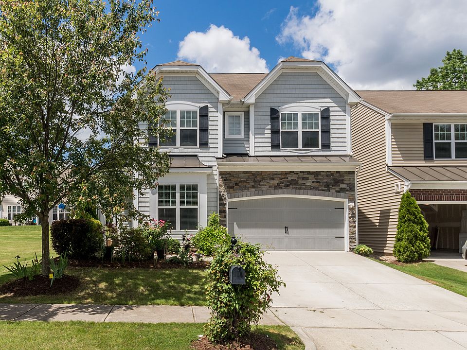 Beautiful N. East facing, main flr Guest suite, End Unit cluster home - in Town Hall Commons, in the heart of the Triangle!This S/F attached-style home does not have common walls w/ neighbrng unit & is sep by a storage room. 4 BR's and a huge 3rd floor attic. Wd floor on main floor, granite counters. First floor guest room with full bath is ideal for your out of town guests, in-laws or home office. Nice backyard and huge side yard! Easy commute to RTP/RDU/shopping/40 & 540! Great schools!