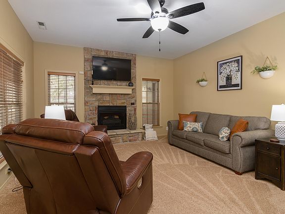 This spacious condo has a Great floorplan and a Garage! View the Golf Course from the large screened in patio! Very Peaceful Atmosphere. You may rent this condo nightly or live here. The distinctive floorplan of the condo makes for comfortable living. Enjoy the new electric fireplace. No worries about the HVAC which was recently replaced in 2024 and has a 10 year warranty. The hot water heater was replaced in 2023. The ceilings have been recently painted. The living room and dining furniture were purchased in 2021 as well as the stainless steel kitchen appliances. The sofa bed in the living room adds some extra sleeping space and all the mattresses were purchased new in 2021. The master closet which is currently locked is very spacious. You will have two extra parking spaces in front of the garage because of this condos unique location. There is also another undesignated parking space in front. This is a great condo in a wonderful community with lots of great amenities as well as a very nice restaurant. It is minutes from Silver Dollar City, great hiking trails, the lakes and the Branson strip! So much to enjoy!