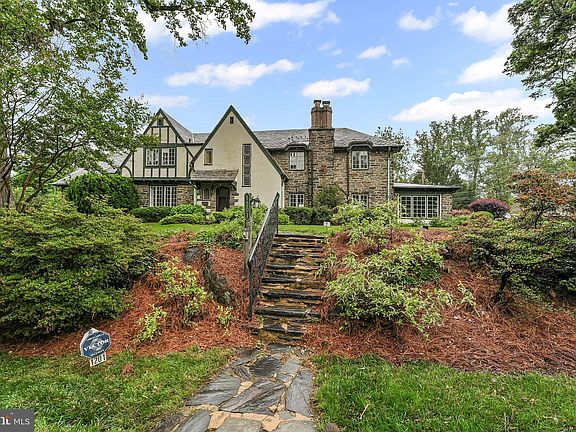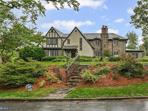 Welcome to this enchanting stone Tudor residence, rich with timeless charm and architectural detail. This spacious home offers 5 bedrooms and 3.5 bathrooms, blending classic elegance with modern comfort. Step through the front door into a gracious marble-floored foyer, highlighted by a curved staircase. Beautiful hardwood floors run throughout, adding warmth and character. The inviting living room features a wood-burning fireplace and French doors which lead to the sunroom. A formal dining room showcases crown moulding and recessed cove lighting, while the adjoining kitchen and breakfast room offer a cozy space for casual meals. A convenient powder room completes the first floor. Upstairs, the primary suite offers a sitting room and en-suite bath. Four additional bedrooms, two hall bathrooms, and an upstairs laundry area provide comfort and practicality for everyday living. The finished lower level includes a generous family room with a fireplace, along with ample unfinished storage space and mechanicals. Outside, enjoy a beautifully landscaped yard with mature plantings, perennial gardens, and a stone patio overlooking a tranquil creek—a serene setting for outdoor gatherings. Located just moments from Whole Foods, Suburban Square, top-rated schools, local parks, and convenient access to SEPTA’s Regional Rail and High-Speed Line, this exceptional property combines elegance, space, and an unbeatable location.